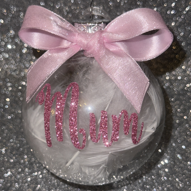 Featuring a transparent gloss finish filled with white feathers, sparkling pink glitter name detailing, and a bold matching pink bow, this 8cm glass ornament brings classic charm to any tree. Hung with a delicate ribbon, it’s the perfect keepsake gift for loved ones or a beautiful way to make your holiday décor uniquely yours.
